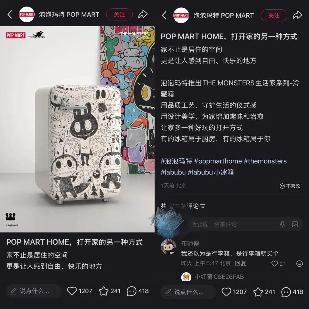 3 月 29 日,泡泡玛特在小红书发布旗下 THE MONSTERS 生活家系列首款家电产品——LABUBU 主题冷藏箱,标志着这家盲盒巨头正式进军家电行业。LABUBU 冷藏箱只是第一款产品,后续还有电水壶、咖啡机、电动牙刷等一系列小家电产品将以 LABUBU 的形象进驻你的日常生活。