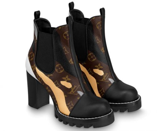 LV x LOL STAR TRAIL 及踝靴,帆布融入英雄主题迷彩,搭配沉稳粗跟与橡胶外底,超越传统的设计为高跟鞋赋予更多可能。